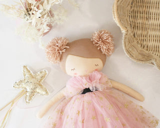 Lovingly handcrafted the Alimrose Halle Ballerina Doll features a soft tulle layered ballet-style dress adorned with sparkly gold stars, delicate embroidered face details, and a whimsical pom-pom yarn hair-do.