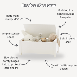 With it's multi-purpose design, the toy box doubles as a sturdy bench seat, making it the perfect spot for kids to put on their shoes before heading out, or a cozy spot to sit and read a book.