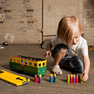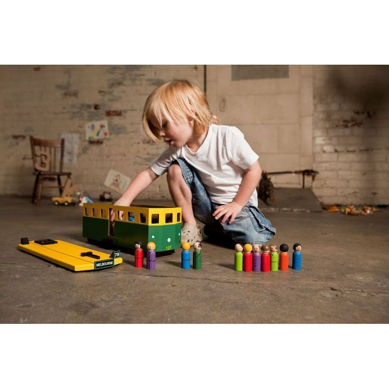This unique wooden tram is beautifully crafted and comes complete with 12 wooden passengers and 2 uniformed tram conductors that have their own cabins on each end of the tram. Ideal for pretend play!