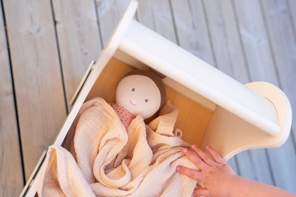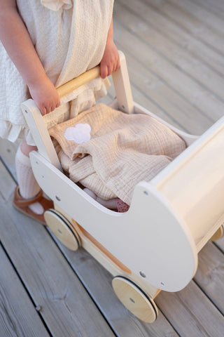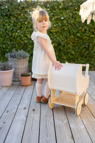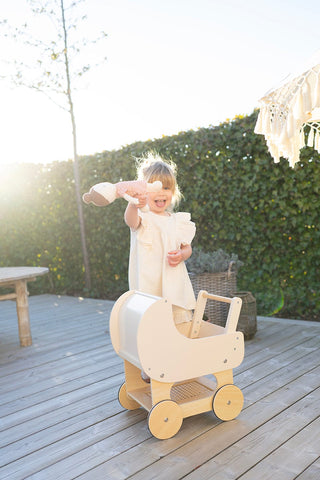 Jabadabado's cute wooden Doll Wagon is a lovely way for your little one to take their favorite doll on a walk. The retro design features a small rattan shelf section underneath the pram for storing doll accessories.
