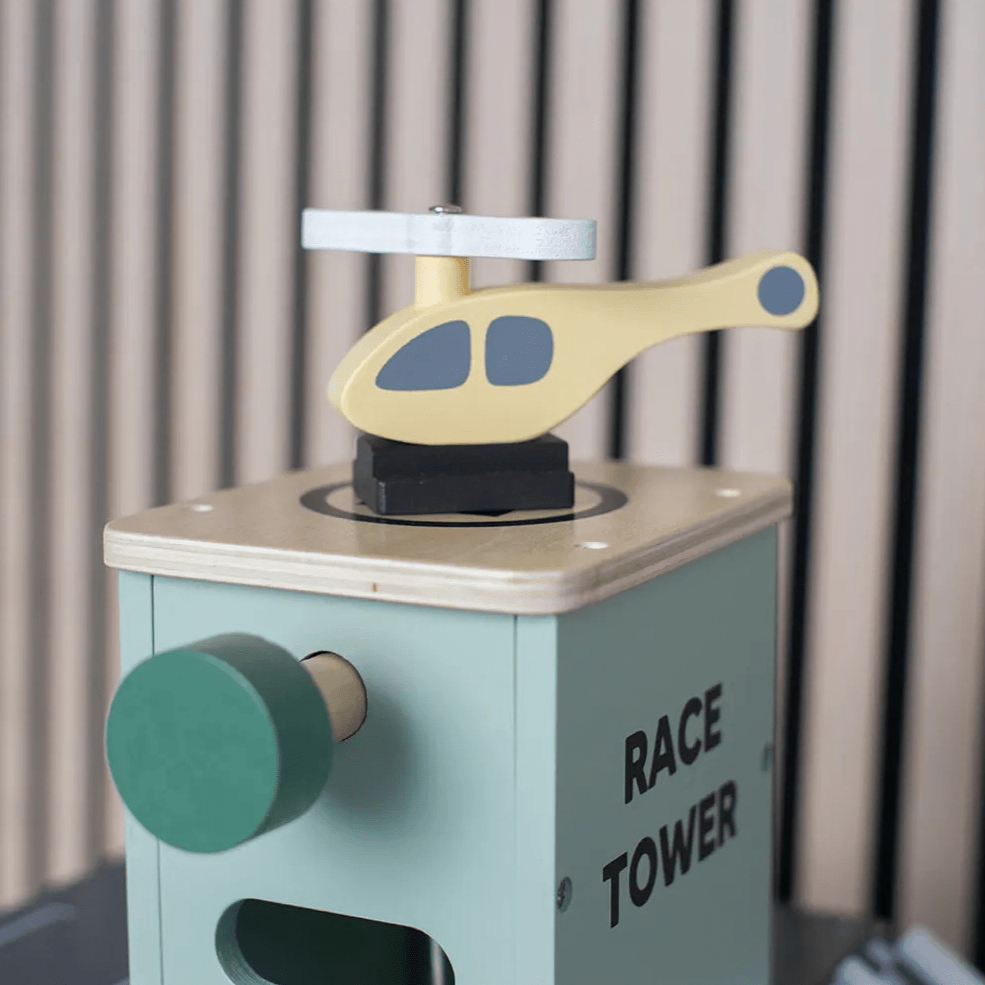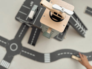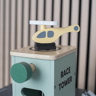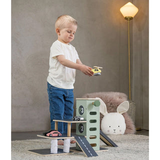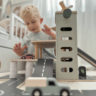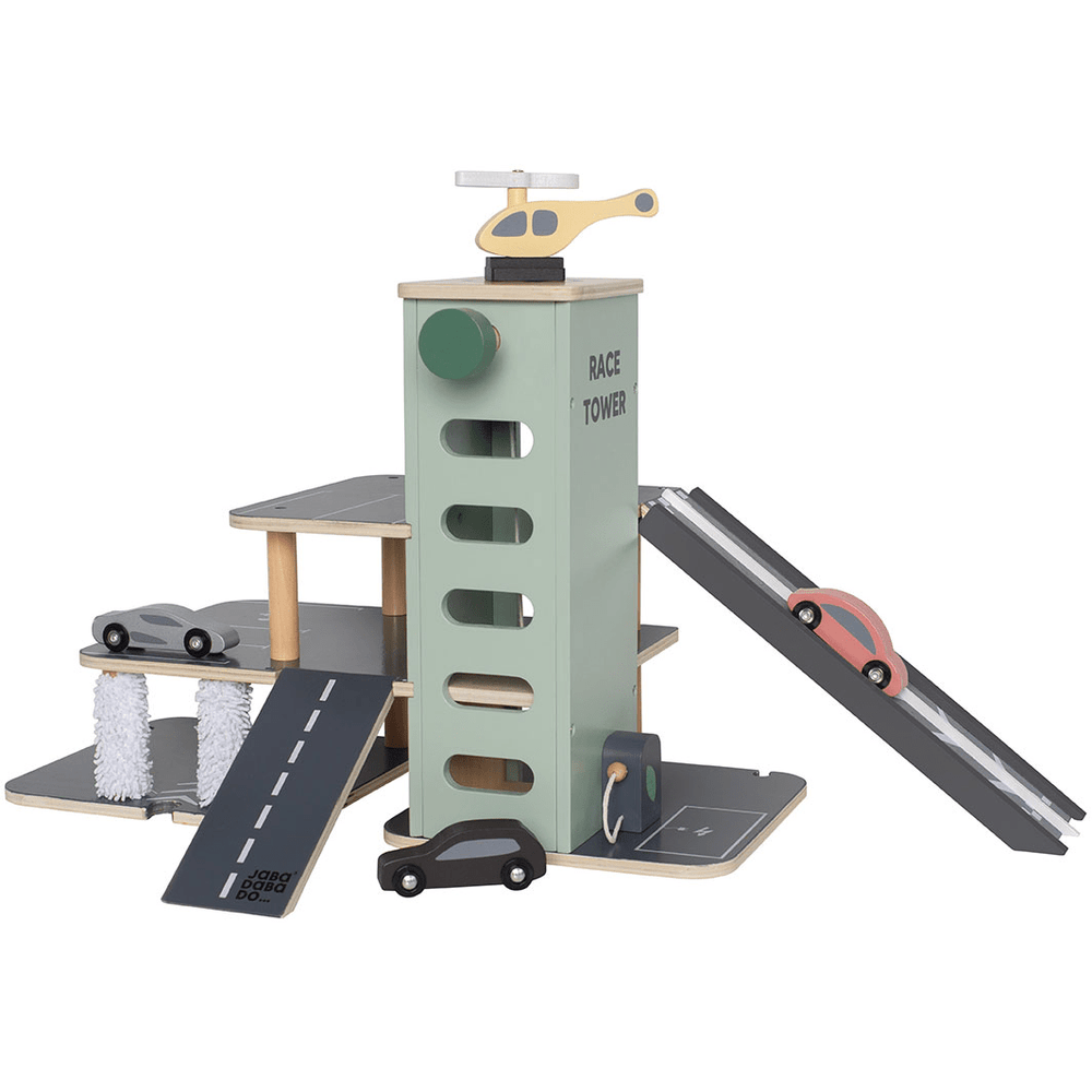 The Parking Garage has three floors. You can move the cars by driving them up the ramps or using the wooden wheel & string controlled car elevator.