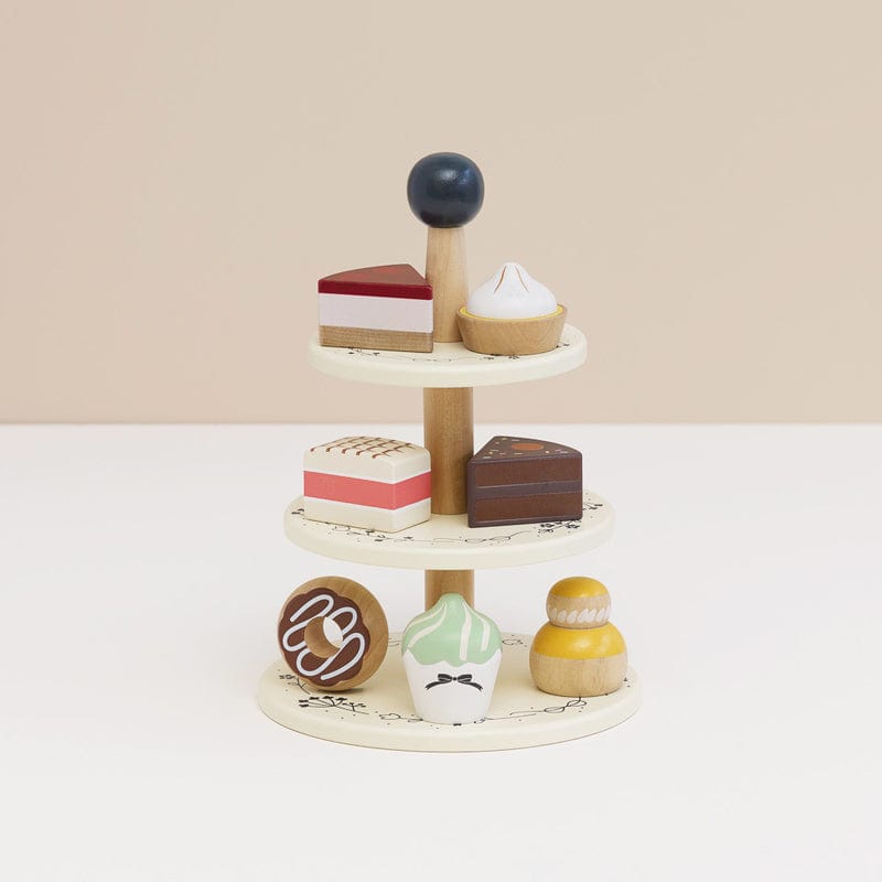 This lovely Three Tier FSCTM - Certified wooden Cake Stand with a selection of 7 delectable, sweet treats is perfect for any occasion. Each tier of this beautifully art-worked cake stand features a different mouth-watering delight. Let taste buds dance as you indulge in a lemon and cream choux bun, a zesty lemon meringue tart, a chocolate doughnut, a three-layered cake, a cupcake, a raspberry cream cake, and a chocolate cake.
