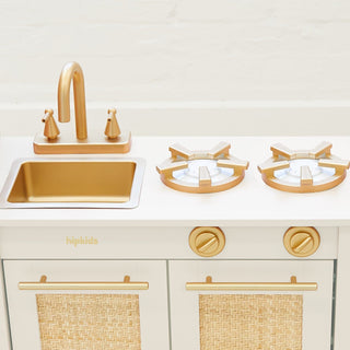 Featuring a two-burner cooktop, a sink, and a spacious storage cabinet with rattan panelled doors —everything your child needs for creative cooking adventures.