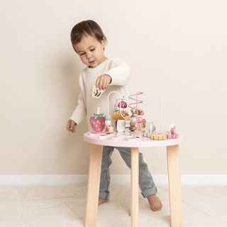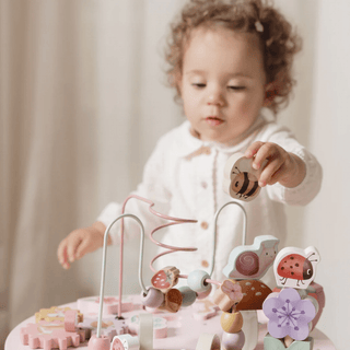 Stand up to play! Discover the many activities this table has to offer. Bring the beads along the spiral from one side of the magical garden to the other side. Or build a tower and fill the garden with flowers and joy. Complete the puzzle, turn the wheels and help the lovely animals cross the Fairy Garden. This wooden multi-activity table challenges your little one in many ways. There are 5 activities to explore that each support the development of fine motor skills. Thanks to the safe and balanced design, the activity table also encourages standing up. And staying up! Because the many features will keep your toddler engaged for a while.