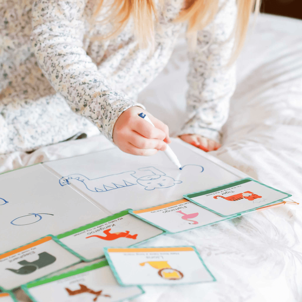 - Includes: Magnetic case, 1 wipe-clean marker, 8 cards and 53 magnets