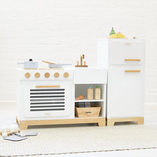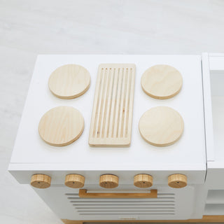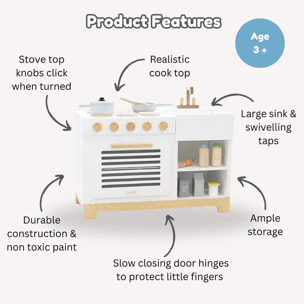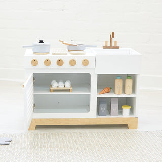 Our Nordic Chef Toy Kitchen includes a 4 burner & grill cooktop, stove, and under sink storage compartment, providing a realistic and engaging play experience, fostering creativity, imagination, and role-play skills in children.