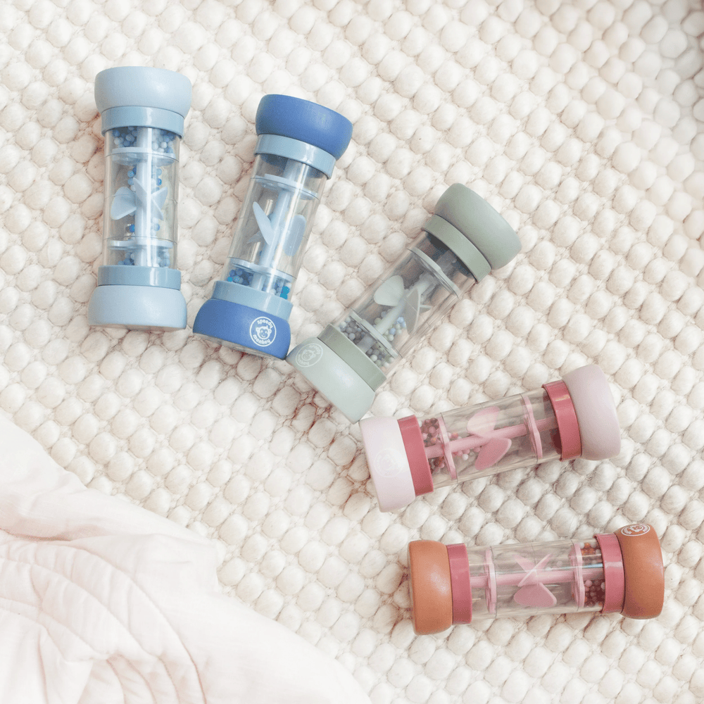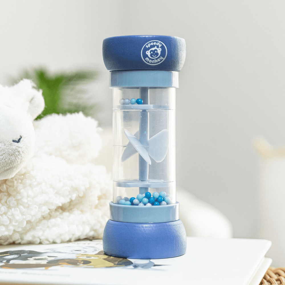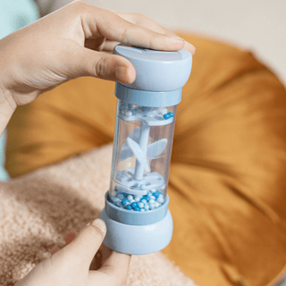 Perfect first musical toy for little kids. Turn this rainmaker over and stimulate senses with trickling beads and soothing raindrop sounds. Perfectly designed shape for toddler hands. Shake it up for added sensory activity. Great for building gross motor skills.