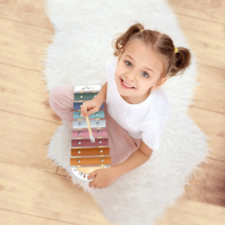 A vibrant xylophone with metallic keys and a single piece wooden mallet that little ones can easily create simple tunes with. Includes a full scale of eight musical tuned bars for an authentic musical experience. Each coloured key matches their assigned notes for learning early music skills. Crafted with smooth edges for little fingers.