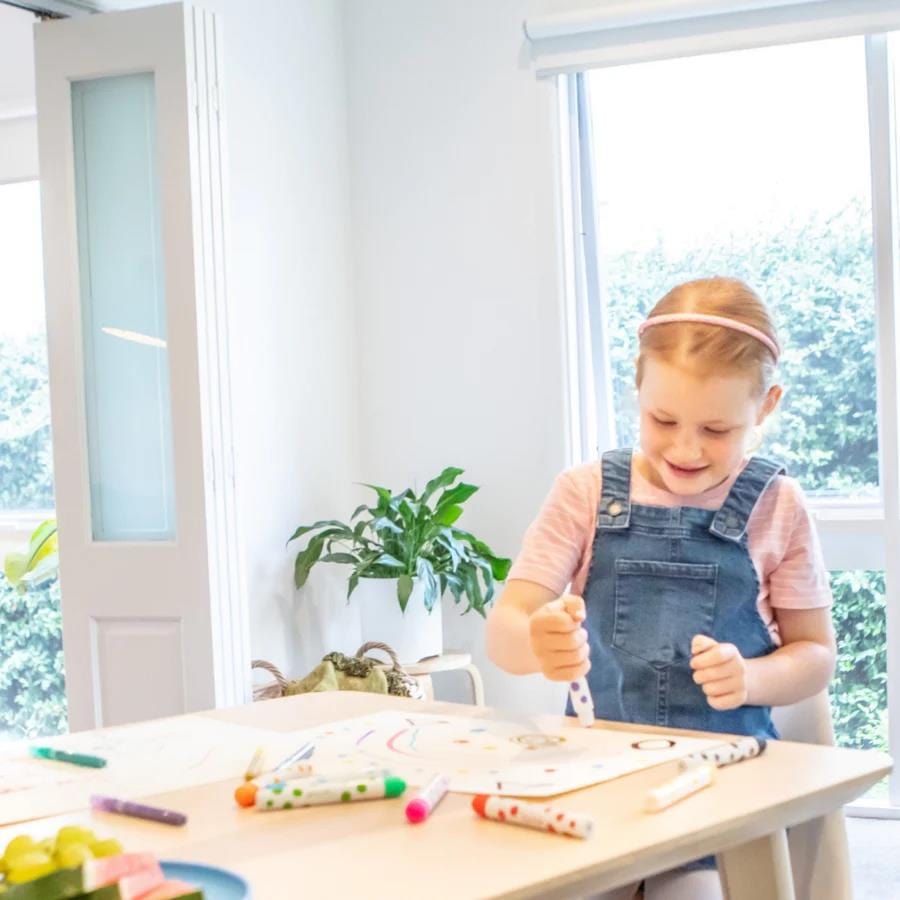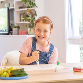 A super fun set of eight high quality, marker-style dot paints. Designed to make painting clean and easy, simply twist off the caps and let the fun begin. No cups or brushes to set up or wash and no drips or spills. Kids will love experimenting with the different effects that can be achieved with the round sponge tip applicator — from fun dotty spots to blending and layering and broad colour sweeps too. The perfect tool for creative art sessions.